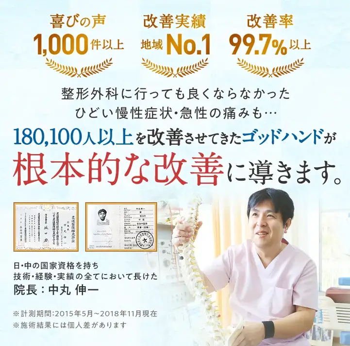 当店の代表は施術歴15年以上、急性慢性合わせて188,100人以上の痛みや不調を解消してきた豊富な実績があります。
